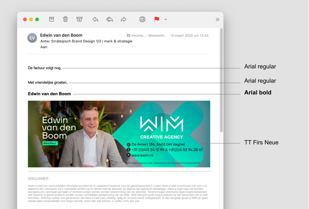 Iedereen krijgt een eigen afbeelding opgemaakt in TT Firs Neue, maar de afsluiting en lettertype in de email is Arial.