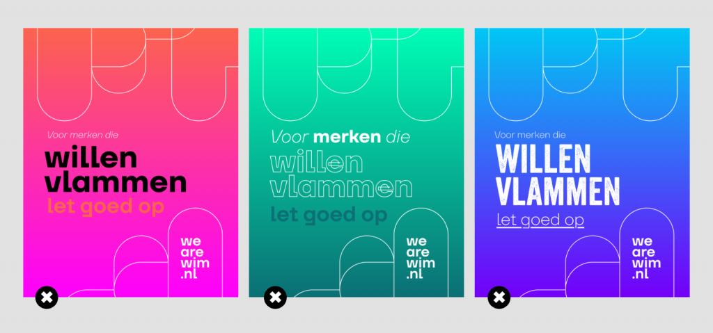 Hier zijn enkele voorbeelden van onjuist gebruik van lettertypes. Vermijd een drukke uitstraling door niet te veel diktes en kleuren te combineren binnen het huisstijllettertype. Houd rekening met de leesbaarheid om effectief te communiceren.