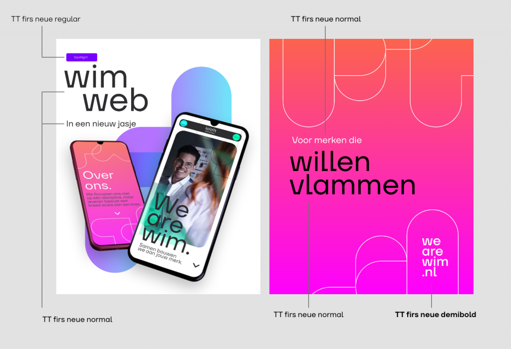 We gebruiken voornamelijk TT Firs Neue Normal en Regular voor de tekst. Voor URL’s gebruiken we Demibold. Houd het simpel: kies waar mogelijk voor de basale dikte (Normal) en gebruik grote, korte koppen om de kracht van het lettertype optimaal tot zijn recht te laten komen.
